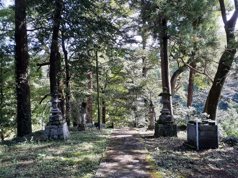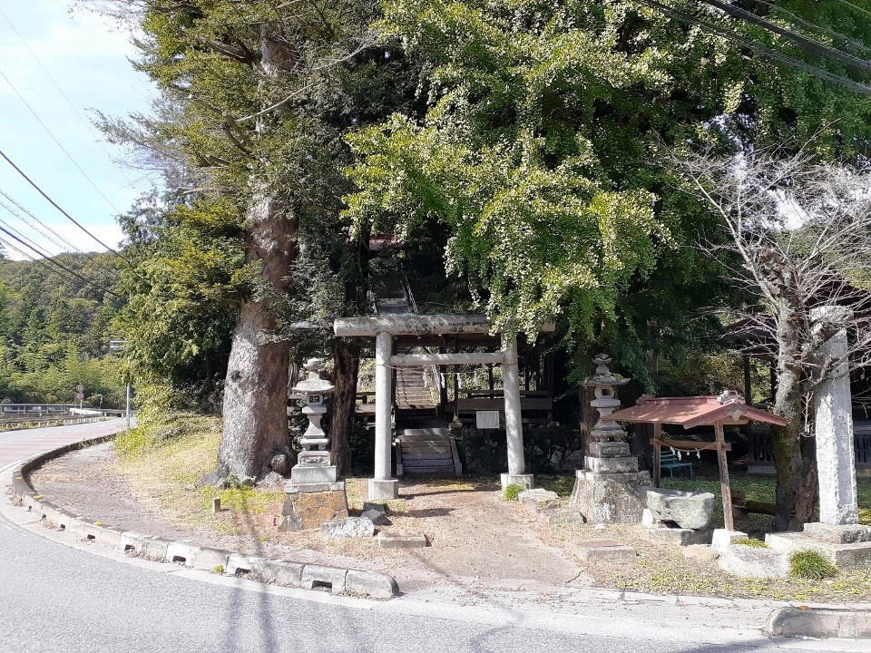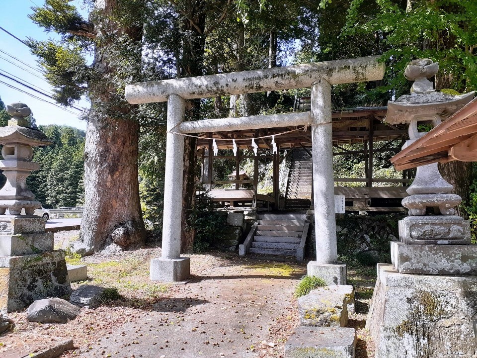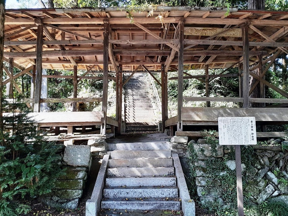 岩長媛命や石凝姥命は、どちらも「石・岩」を共有し神格化した女神である。案内板には「往古より当所の鎮守として奉斎してきた神社であり、社殿は元来境内の後方の神山の嶺にあったが、いつのころか今の社地に移された」と記載されていて、筆者が想像するに、記紀の神話に組み込まれる前の、本来のご祭神は「神山」ないしは「神山に存在した磐座」ではなかったのではなかろうか。