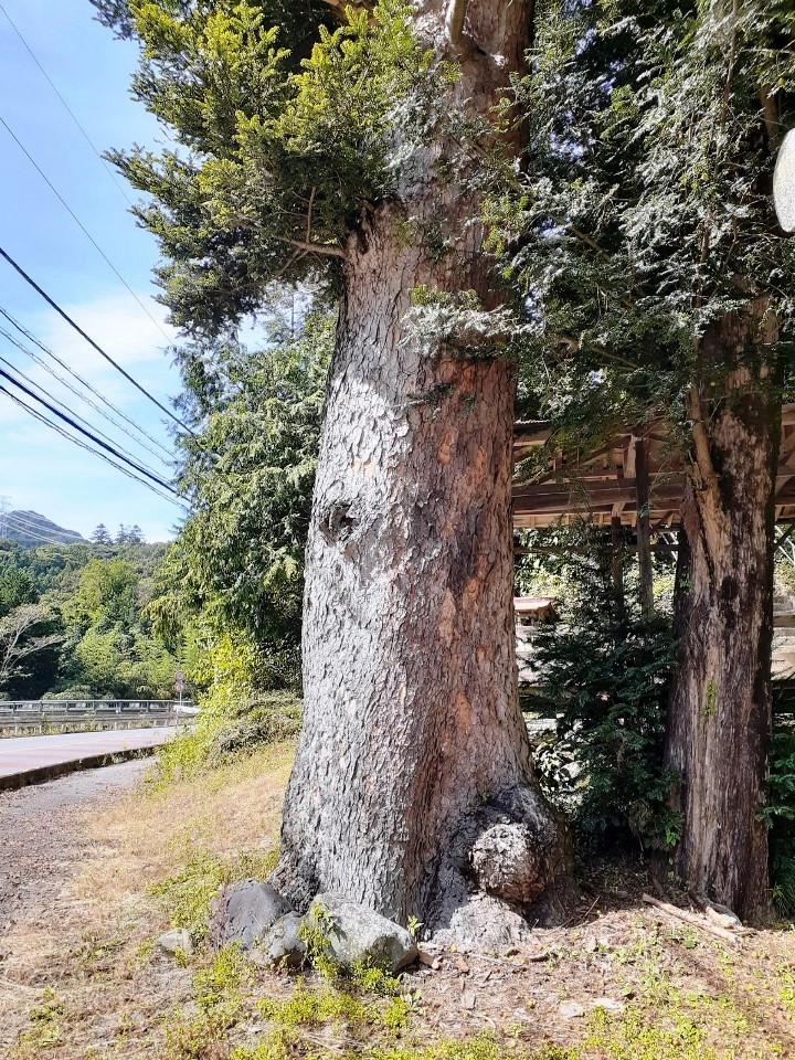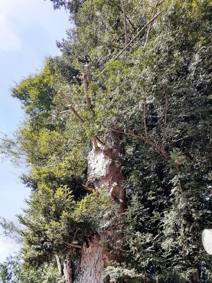 鳥居の左側で、県道沿いに聳える巨木。ご神木の類だろうか。