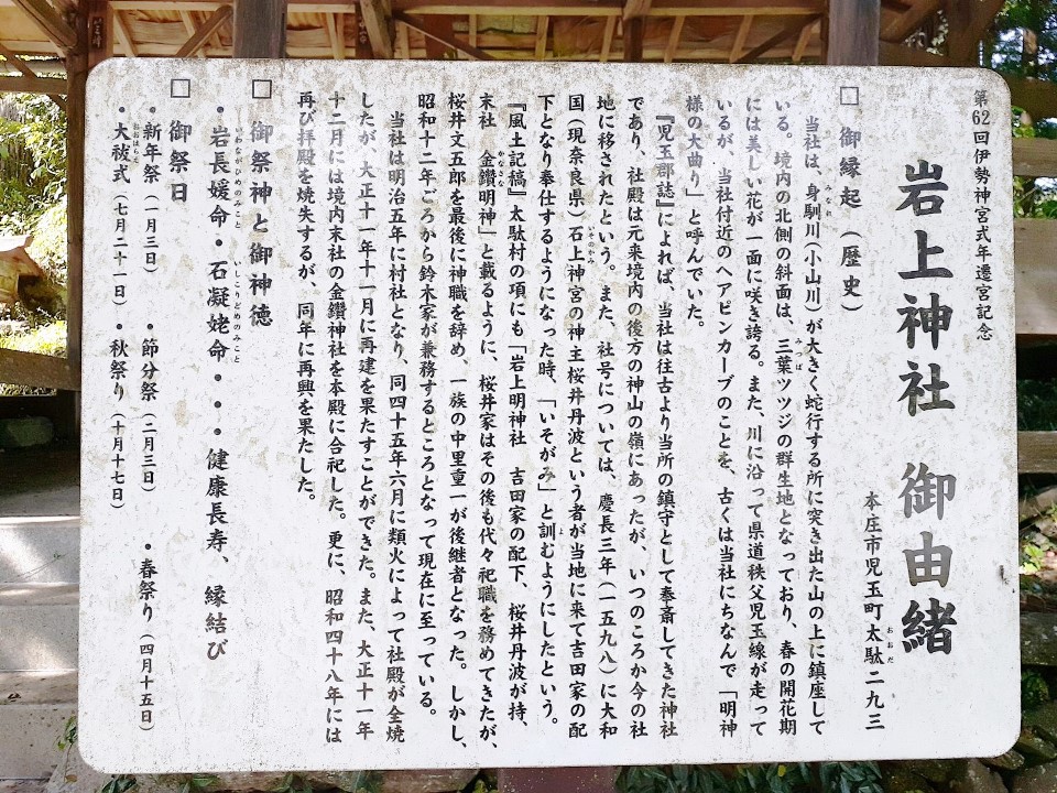『児玉郡誌』によれば、当社は往古より当所の鎮守として奉斎してきた神社であり、社殿は元来境内の後方の神山の嶺にあったが、いつのころか今の社地に移されたという。また、社号については、慶長三年(一五九八)に大和国(現奈良県)石上神宮の神主桜井丹波という者が当地に来て吉田家の配下となり奉仕するようになった時、「いそがみ」と訓むようにしたという。 『風土記稿』太駄村の項にも「岩上明神社吉田家の配下、桜井丹波が持、末社金鑽明神」と載るように、桜井家はその後も代々祀職を務めてきたが、桜井文五郎を最後に神職を辞め、一族の中里重一が後継者となった。しかし、昭和十二年ごろから鈴木家が兼務するところとなって現在に至っている。