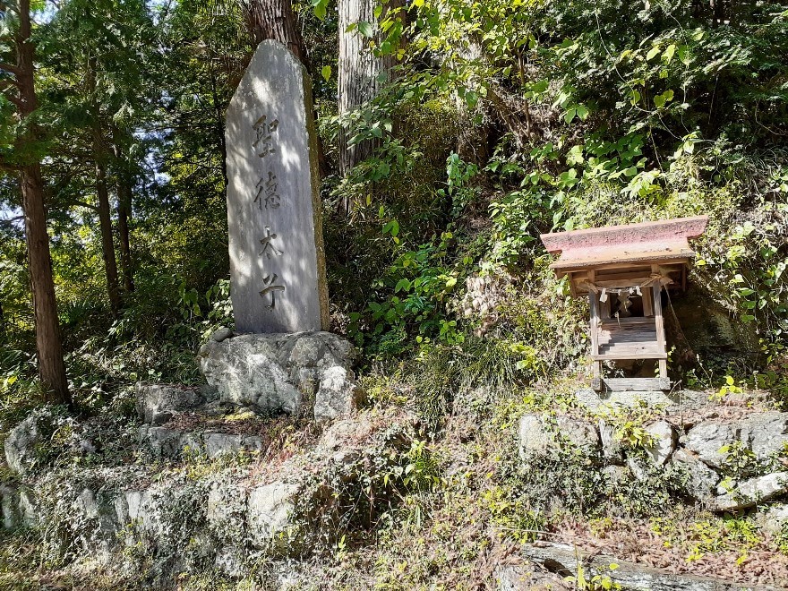 割拝殿の先にある石段を登る。 石段の左側にある「聖徳太子」碑と