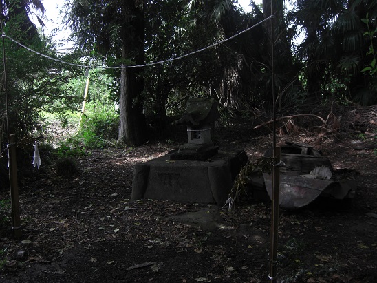 社殿の左側にある境内社群        境内社群の手前にある石祠 祠の台座は石棺か?
