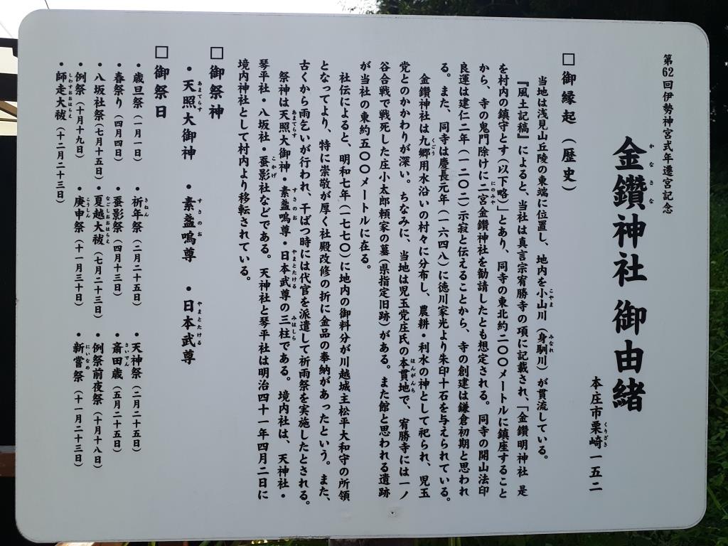 当地には古くから神楽が伝わり、金鑽神楽本庄組と称する神楽師の組織を作っている。神楽の始まりは、上野台村(深谷氏上野台)の八幡神社に古くから伝わる神楽が、岡村(岡部町岡)の森田組を経由して、江戸後期に当地に伝えられたといわれている。