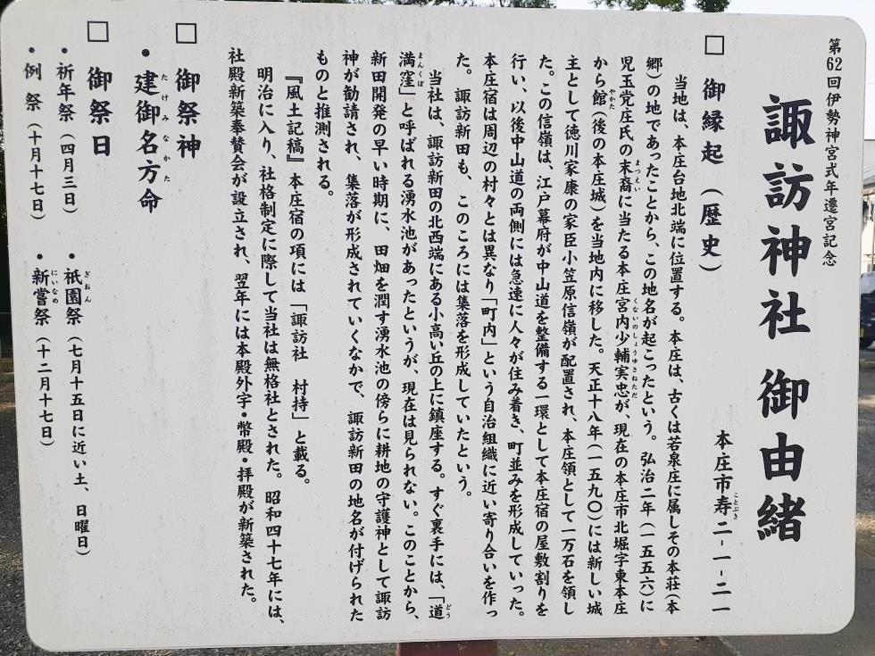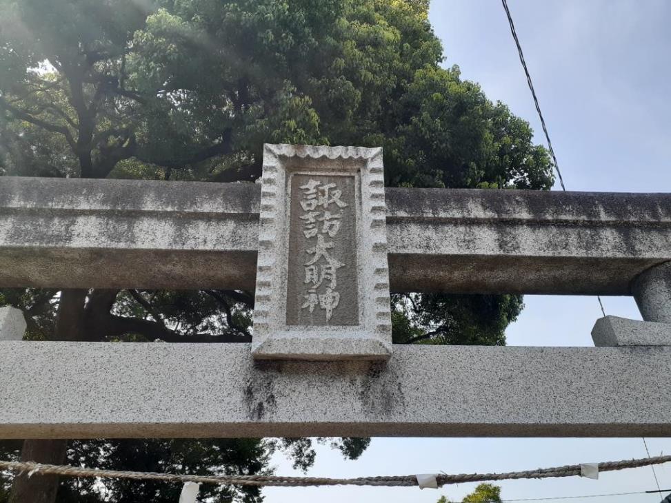 鳥居には「諏訪大明神」と刻まれた社号額あり 鳥居の左側には案内板が設置されている。