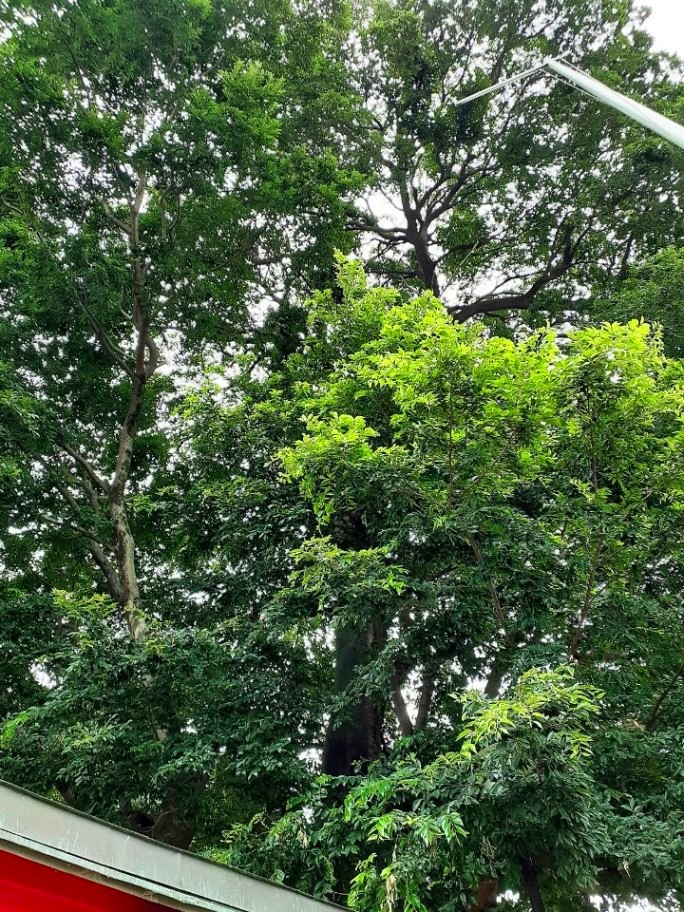 鳥居のすぐ右側にはご神木が聳え立つ(写真左・右)