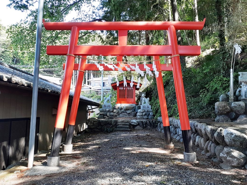社殿の左手に鎮座する境内社・合祀社 境内の奥手には今の季節水量は多くないが、