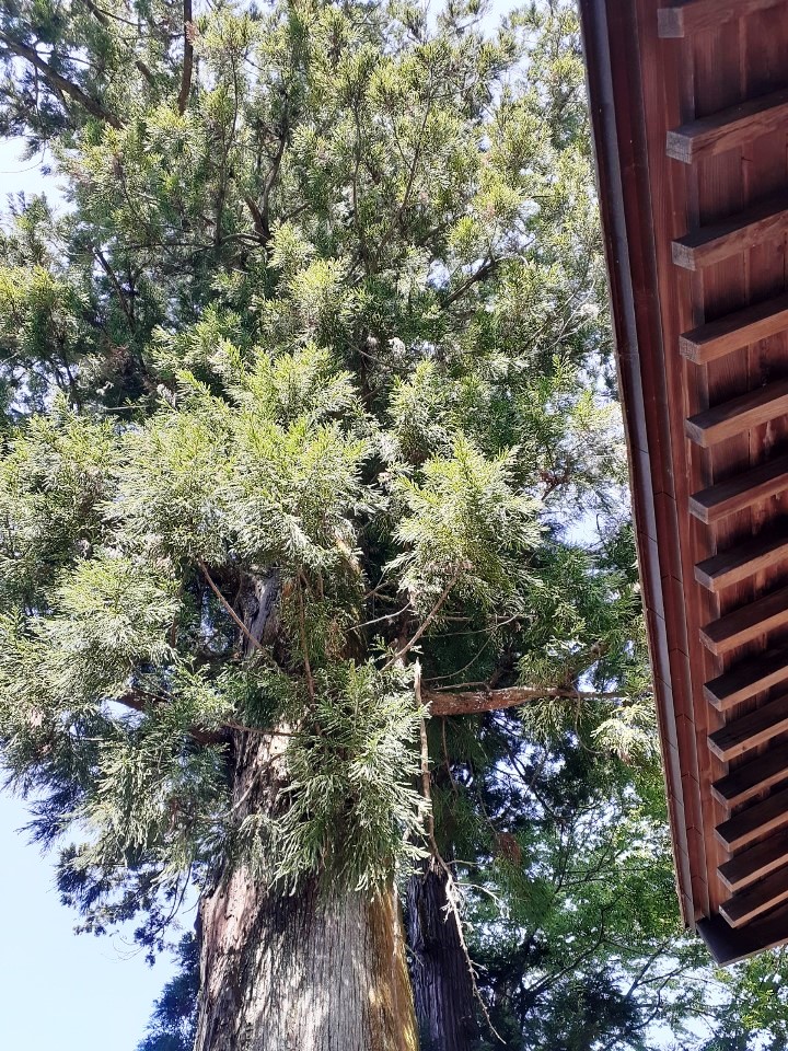 鳥居に対して右側に聳え立つ大杉(写真左・右)