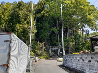 日影となっているが社叢林中央下部の間からは木製の鳥居や社号標柱が見える。
