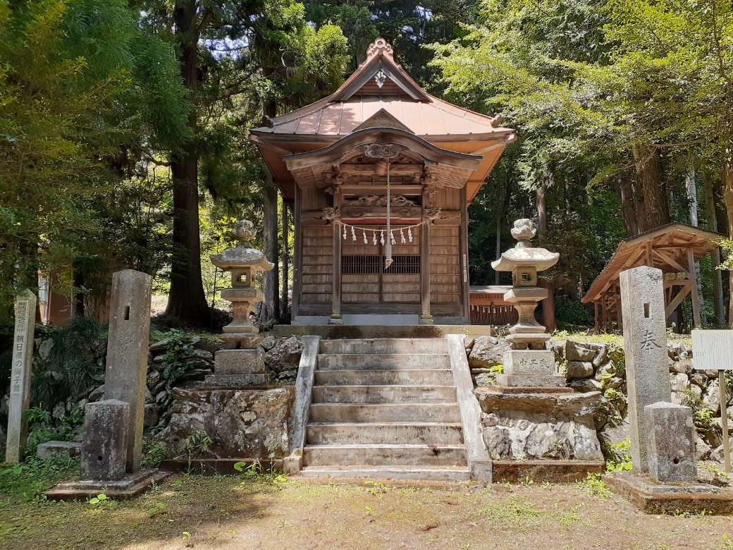 東秩父村の埼玉県道11号熊谷小川秩父線沿いに鎮座する皆谷天児安神社を更に450m程南下し、「朝日根方面」「ヤマメの里公園駐車場」の看板が見えるT字路を右折する。くねくねと曲がった山道が暫く続き、途中何本も脇道もあるが、我慢して山道を3㎞程進む。車を走らせながら森林に囲まれた薄暗い山道を進んだかと思うと、急に辺りは明るくなり、民家というか集落も所々に点在していて、陽光が燦々と降り注ぐ山の斜面には広々とした段々畑もあり、晴天という天候も相まって、そこには綺麗な山なみの景観を楽しむことができる。
