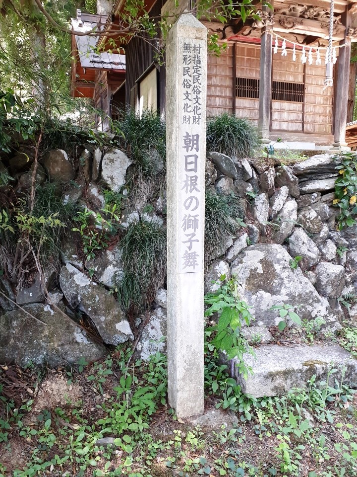 拝殿の手前左側で、案内板と対に設置されている「朝日根の獅子舞」の標柱