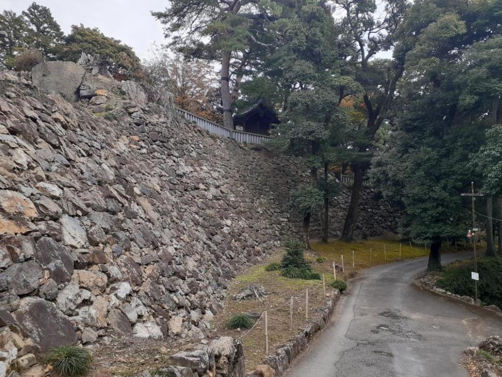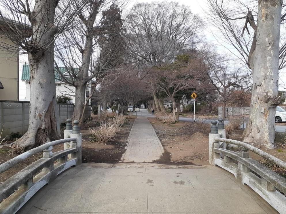参道に沿って伸びる道との間には、高低差があり、その段差をレンガ壁にて補強・維持している。