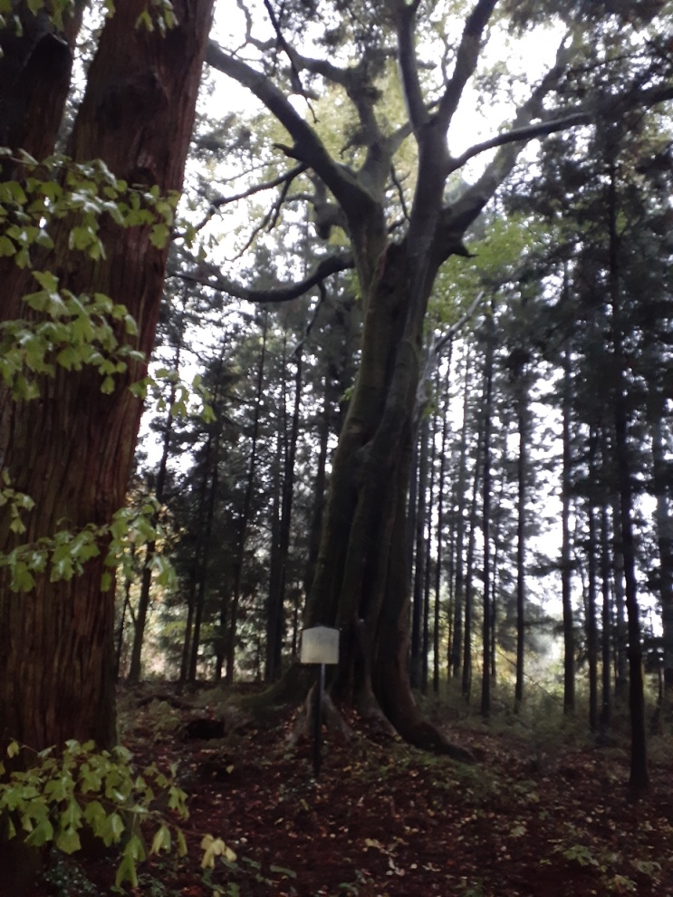 ご神木の「生岡の杉」の奥手には、日光市指定天然記念物である「生岡神社のエゾエノキ」もある(写真左・右)。1994年8月11日指定。案内板に「幹・根元に見られる板状あるいは盾状の襞(ひだ)は他に例を見ない特異なもの」と記されているように、凹凸の幹が独特の陰影をこの木に与えているようだ。