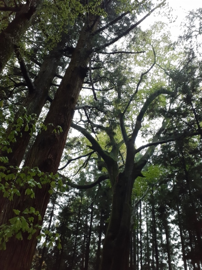 社殿奥に聳え立つご神木である「生岡の杉」(写真左・右)