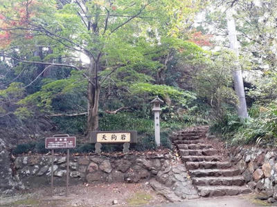 参道に通じる正面ルート右側に「天狗岩」の看板あり