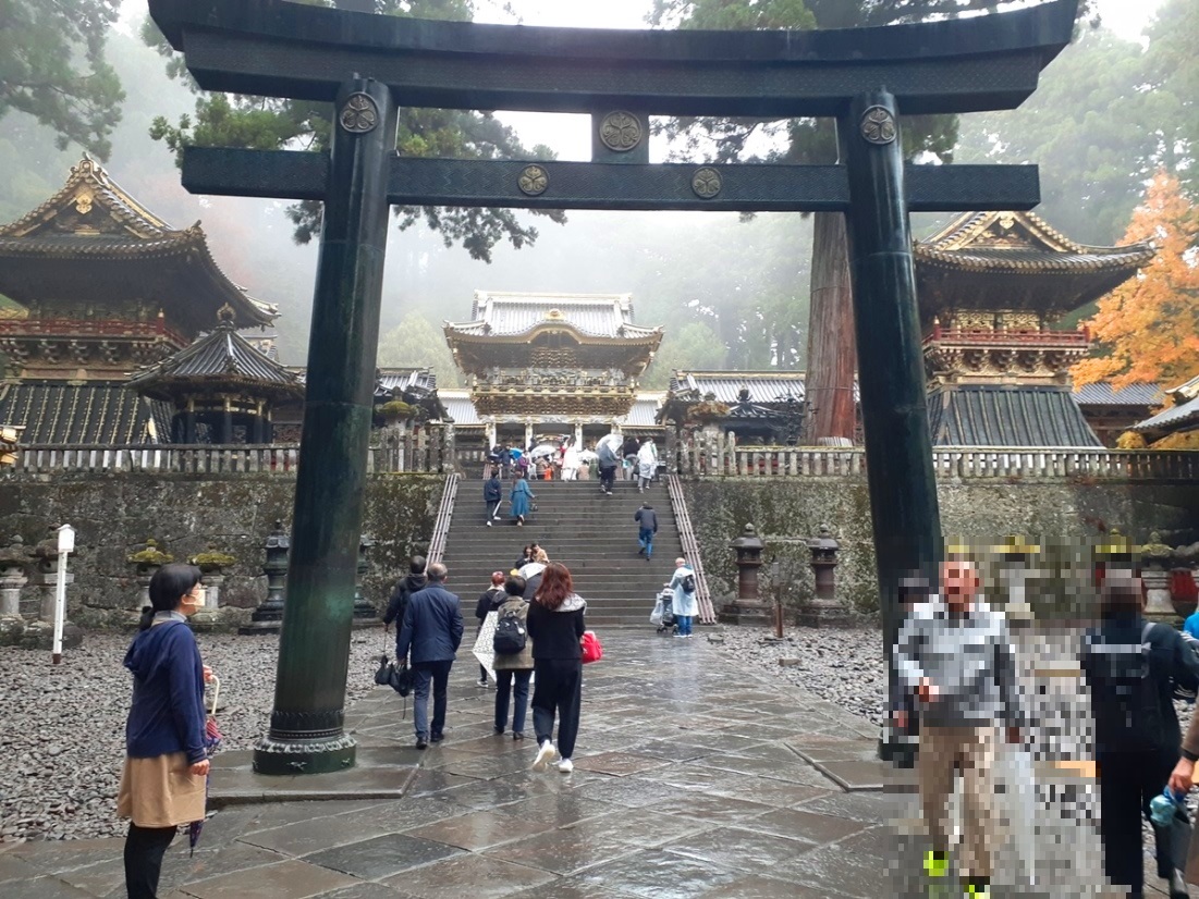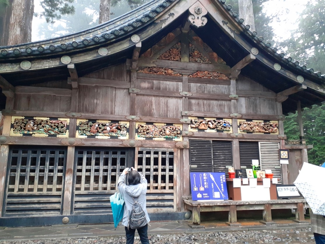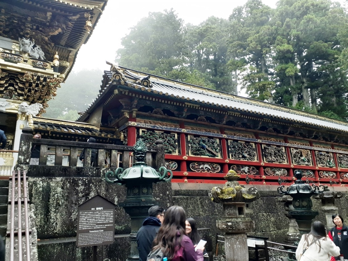 神厩舎に描かれている「三猿」撮影終了し、青銅製の鳥居の先に見える陽明門へ進む。雨交じりの天候に加えて、周囲には霧が立ち込めているその雰囲気が、逆に神聖さや荘厳さを高めているようにも見える。