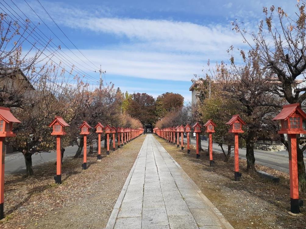 街中に鎮座している社でありながら落ち着きがあり、天神様を祀る社故梅が参道両側に100本ほど植樹されているという。梅の開花時期は見ごたえがありそうだ(写真左・右)。また、参道一帯に奉納されている朱の灯篭が地域の方々の信仰の厚さを物語っていよう。