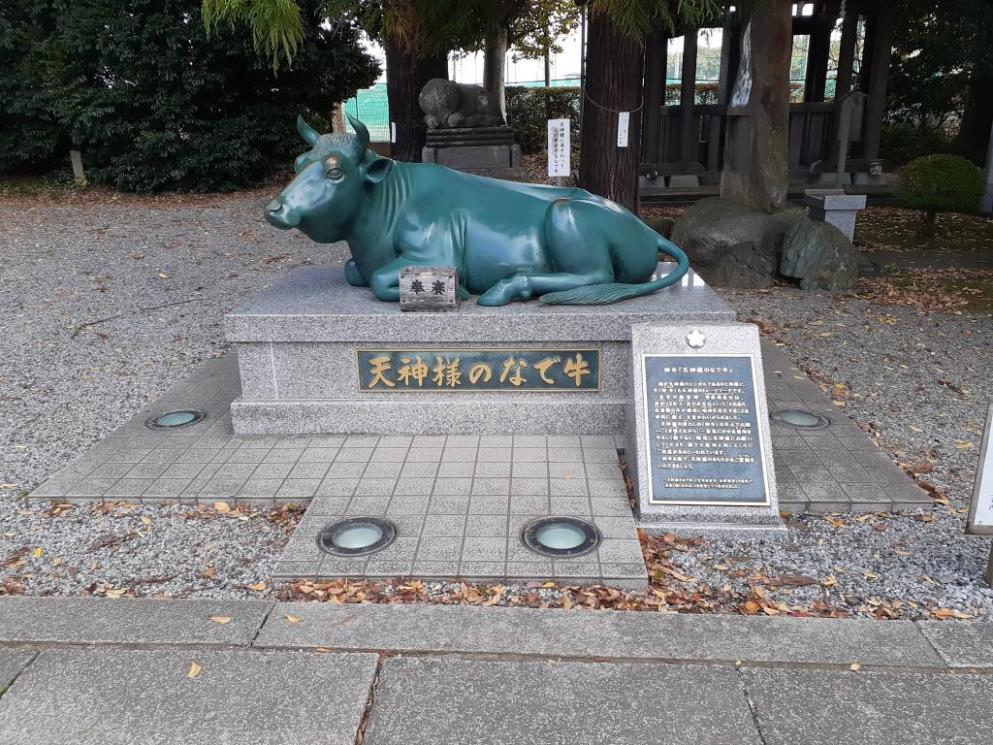 天神様の神使は牛。自分の悪い部分と同じ箇所をなでると、悪い部分が牛に移って、改善されるといわれている。