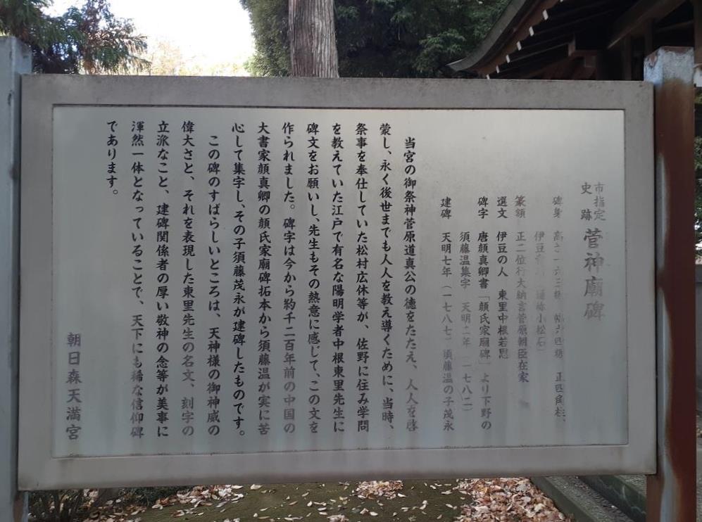 当宮の御祭神菅原道真公の徳をたたえ、人々を啓蒙し、永く後世までも人々を教え導くために、当時、祭事を奉仕していた松村広休等が、佐野に住み学問を教えていた江戸で有名な陽明学者中根東里先生に碑文をお願いし、先生もその熱意に感じて、この文を作られました。碑字は今から約千二百年前の中国の大書家顔真卿の顔氏家廟碑拓本から須藤温が実に苦労して集字し、その子須藤茂永が建碑したものです。