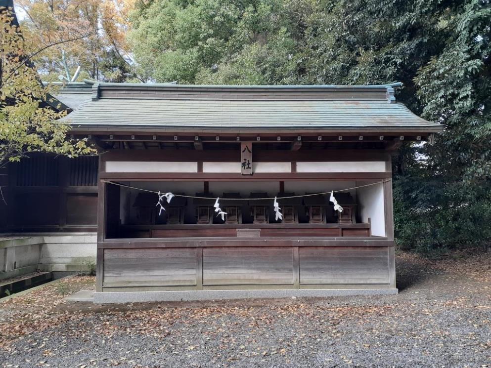 各社には木札があるのだが、薄く読みずらい。左より大市姫神社(大市姫命)・琴平神社(大物主命)・八坂神社(素戔嗚命)・〇〇神社(武甕槌命)・白山神社(菊理媛命)・〇〇神社(猿田彦命)・稲荷神社(宇迦之御魂命)・日本武神社(日本武命)。