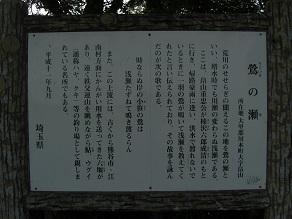 荒川のせせらぎの聞えるこの地を鶯の瀬といい、増水時でも川瀬の変わらぬ浅瀬である。