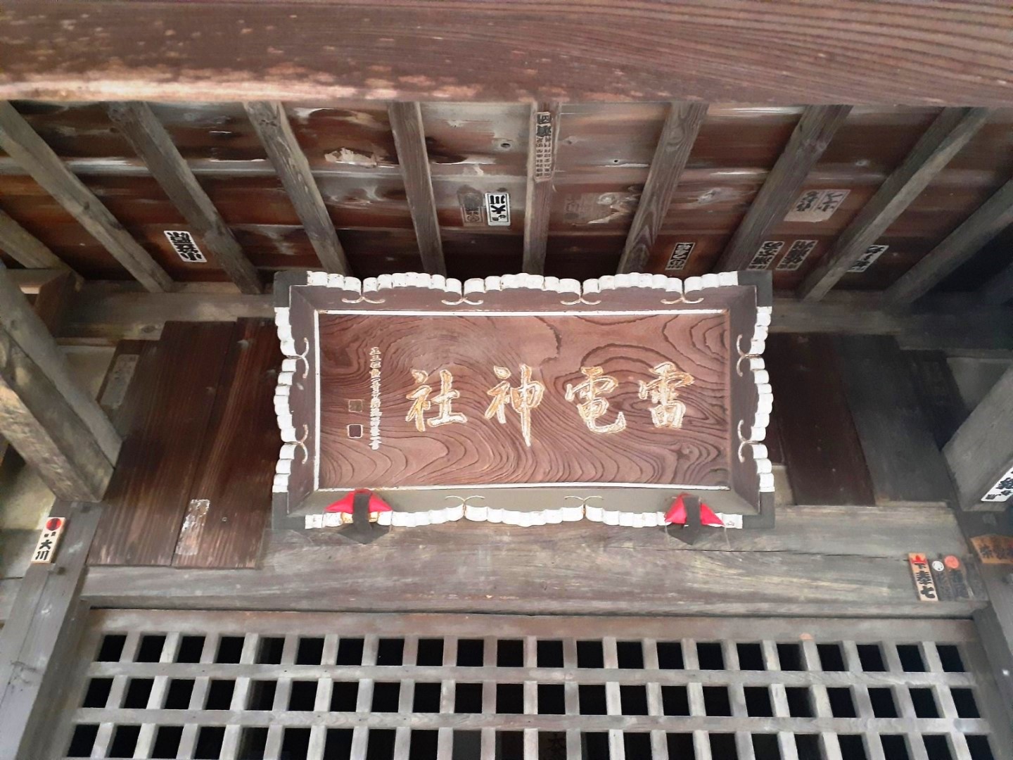 拝殿には渋沢栄一の揮毫した扁額が掲げられている(写真左)。扁額は横文字で「雷電神社」と書かれてあり、縦書きで「正三位 勲一等 子爵 渋沢栄一書」とある。本殿(写真右)には雷電像を安置している。昔は「雷災除け」の神札を授与していた。落雷を除き、もろもろの崇りを避けるというので信仰されたという。