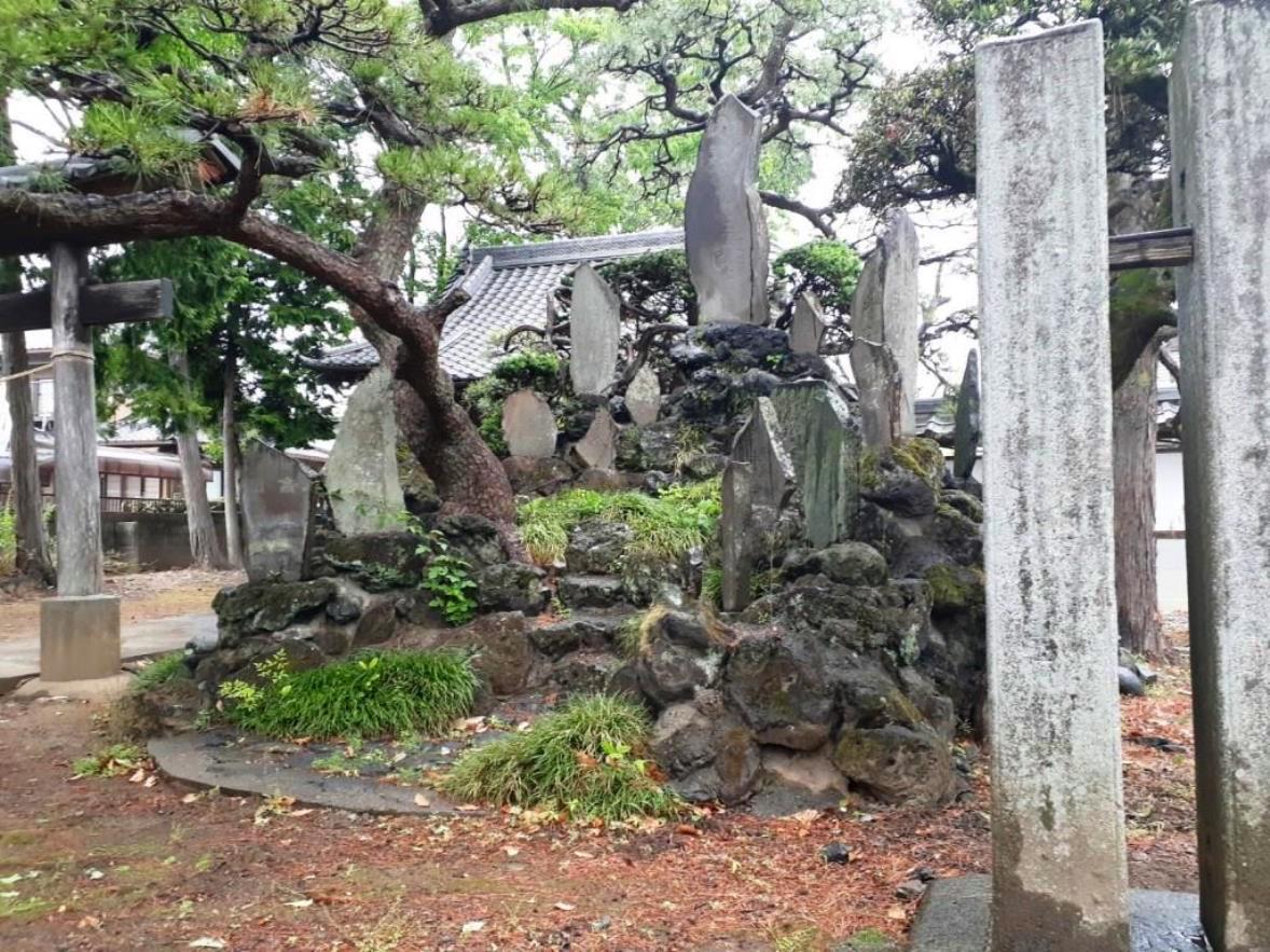 拝殿手前、右側にある御嶽塚 拝殿手前左側に並んである石碑等