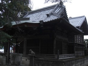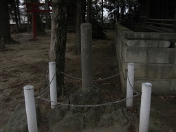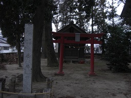 本殿の左側には境内社 稲荷社 明治43年大洪水の水標が拝殿前にある。
