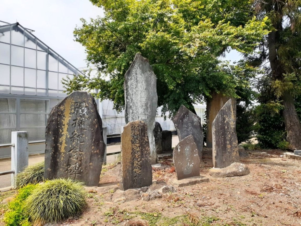 社の入口左側にある石碑群 左から八坂神社・天手長男神社・浅間宮