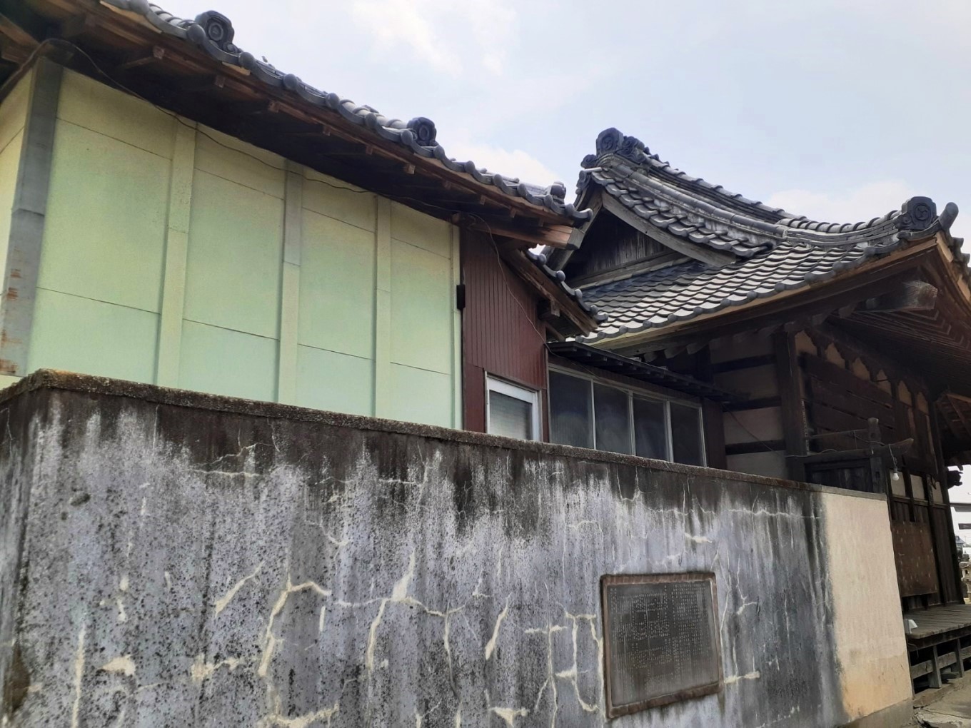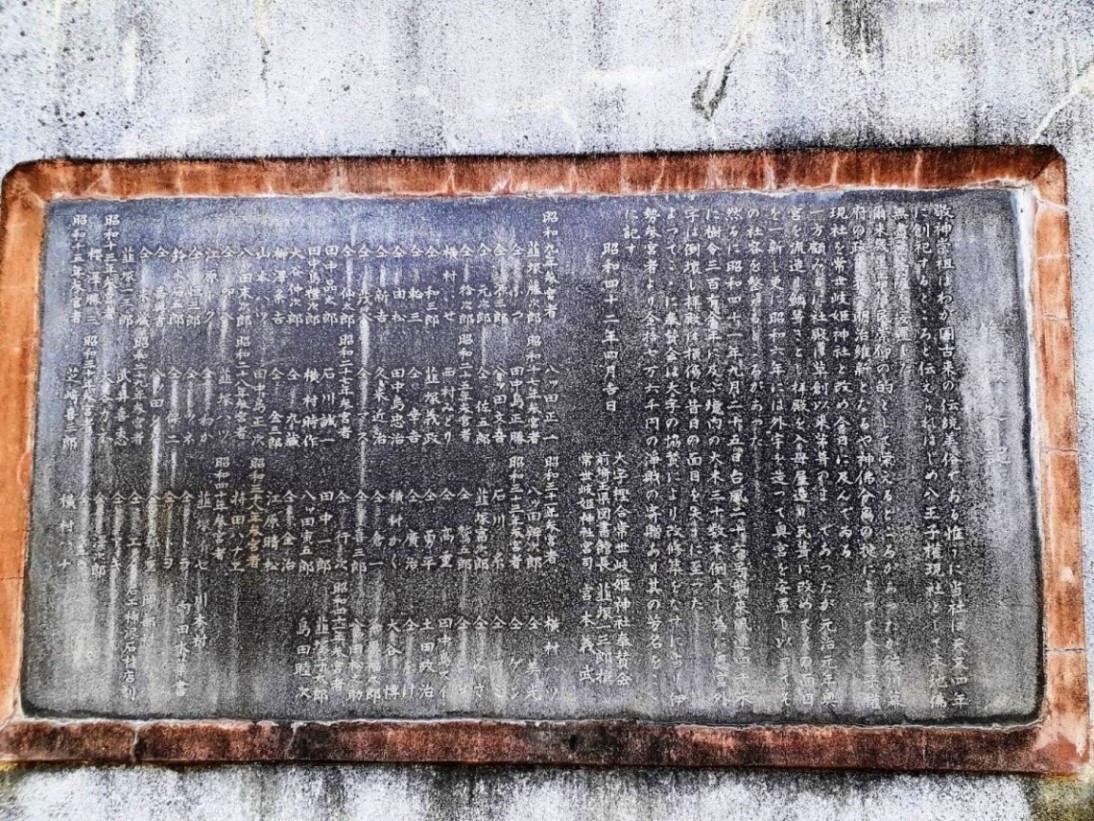 本殿並びに拝殿部との間には「修復之記」記念碑がはめ込まれている。