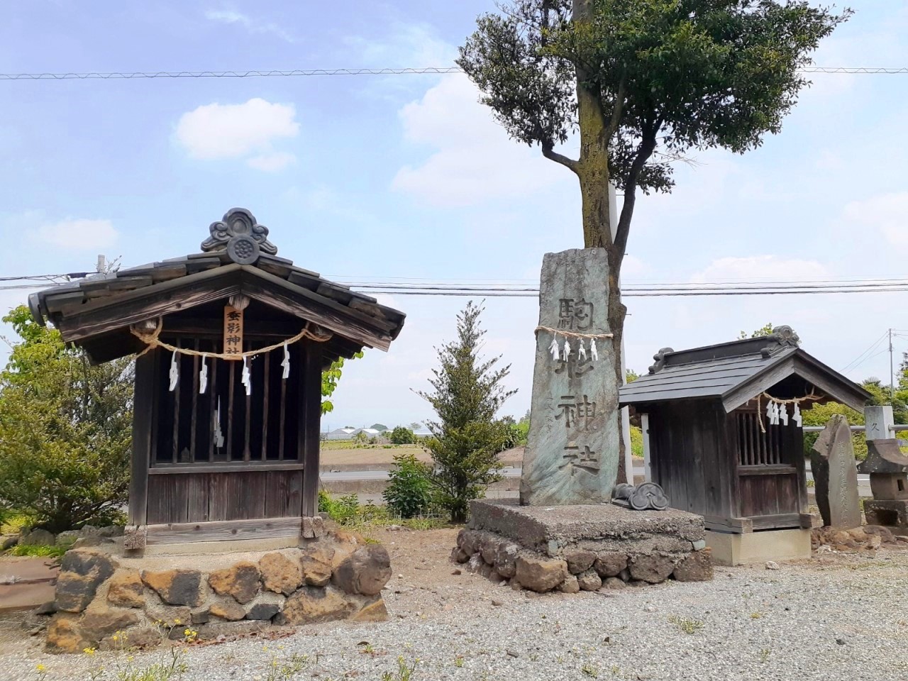 社殿右側奥には左から蚕影神社・駒形神社石碑・その右側の境内社は不明(写真右)。