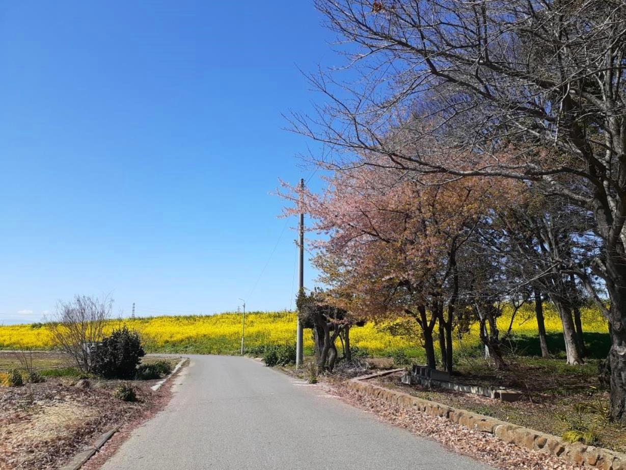 社の後方で、小山川土手に広がる菜の花の風景
