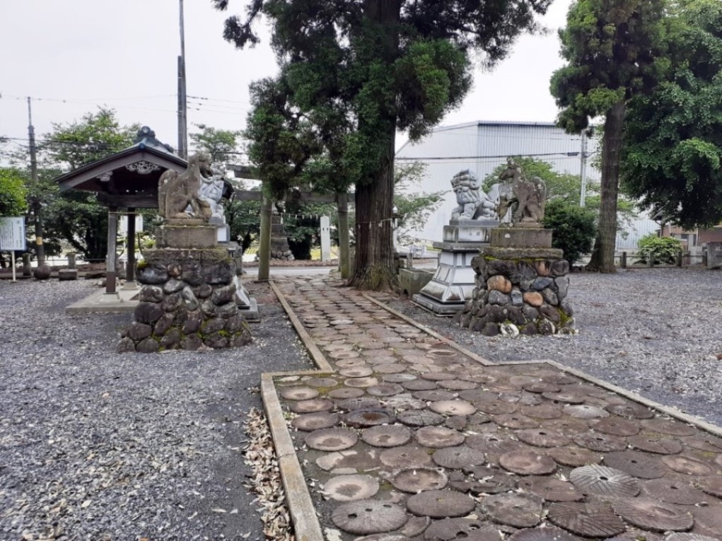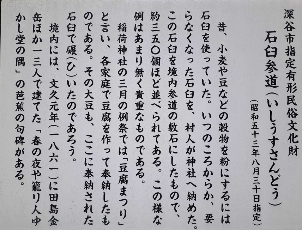 昔、小麦や豆などの穀物を粉にするには石臼を使っていた。いつのころか、要らなくなった石臼を、村人が神社に納めた。この石臼を境内参道の敷石にしたもので、約三百五十個ほど並べられてある。この様な例はあまり無く貴重なものである。