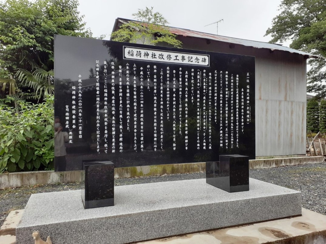 皆様に、貴重な浄財を多大に寄進して戴き、拝殿・境内の改修、神輿庫の改築、水屋の改修、末社の整理と覆屋の新築を行い、ここに稲荷神社改修奉祝祭を斎行し、依って記念碑を建て関係者一同の芳名を刻み永く記念とします。