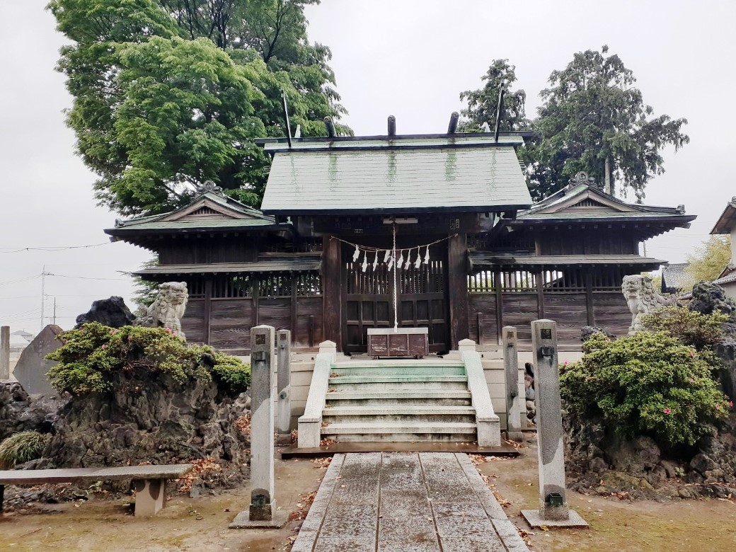 神門があり、拝殿や本殿は瑞垣でしっかりと囲まれている。この社の境内自体が自然堤防の縁みたなところで周囲の田んぼより高くなっているが、社殿は更に石垣でかさ上げされた基礎の上に鎮座している。宝暦年間(1751~64)の利根川の洪水に対する教訓からくる備えなのだろう。