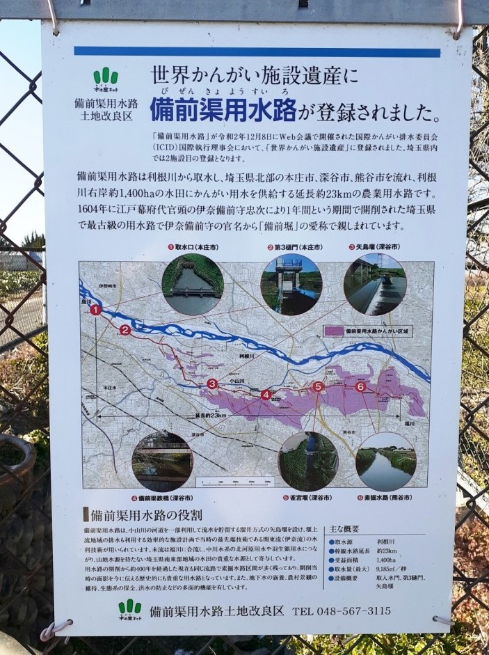 1604年に江戸幕府代官頭の伊奈備前守忠次により、1年間という期間で開削された埼玉県で最古級の用水路で、伊奈備前守の官名から「備前堀」の愛称で親しまれています(中略)