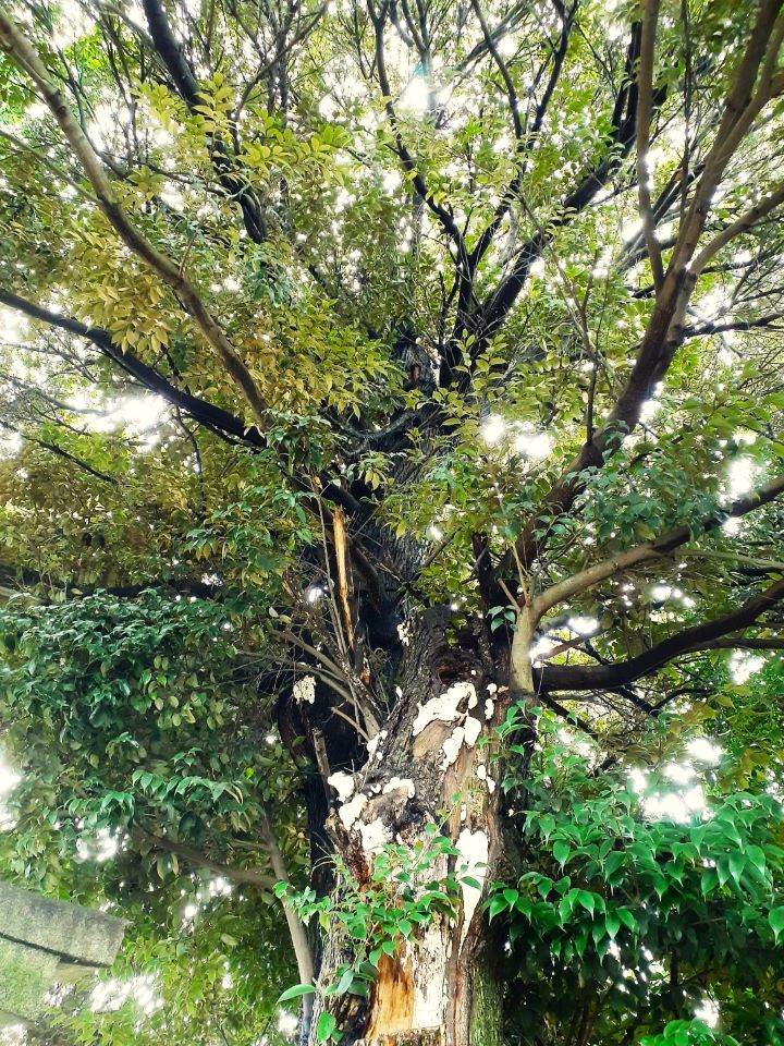 紙垂等はないが、二の鳥居付近に聳え立つ巨木。