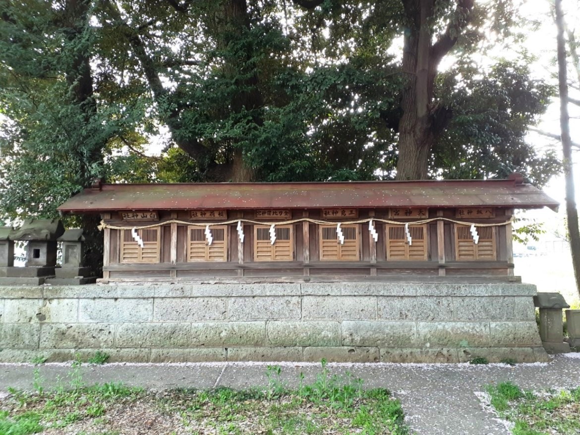 合祀されている社は、左から白山神社・稲地神社・金刀比羅神社・三島神社・天神社・八坂神社。その周囲にある石祠3基は不明。『風土記稿』小八ツ林村の項には、当社について「春日社村の鎮守とす 末社 天神」とあるほか、村民持ちの白山社・八幡社・第六天社及び稲荷社、大福寺持ちの雷電社、十林寺持ちの頭殿社・稲荷社についての記載があり、そのどちらかもしれない。