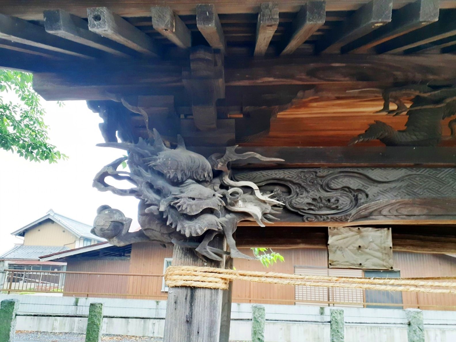 鳥居(写真左)を越えてすぐ左側に手水舎がある(写真右)。この手水舎はこの規模の社では考えられない位の精巧な彫刻が施されている。