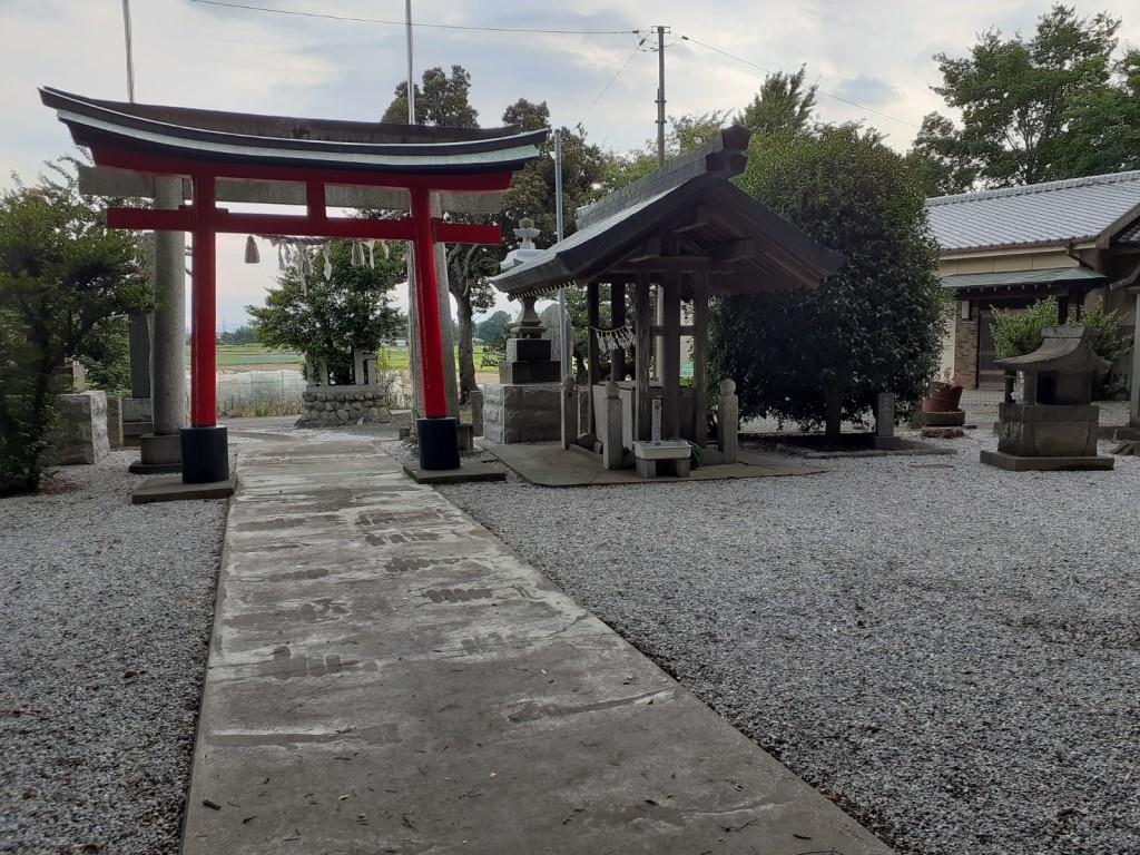 社の西方向で、埼玉県道・群馬県道276号新堀尾島線沿いには社号標柱が立っている。