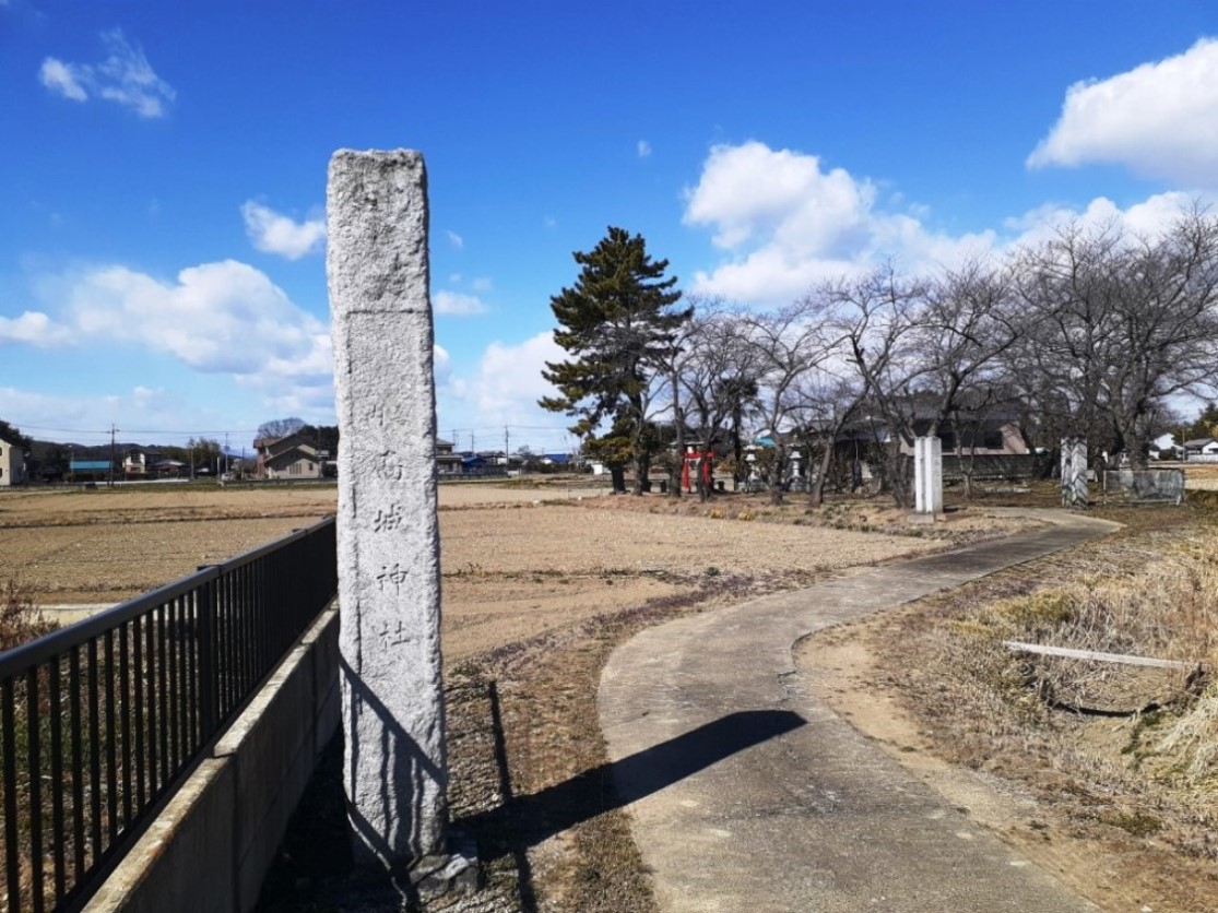 高本高城神社は南市田神社の南方に位置する。大里中学校を右手に見る道を真っ直ぐ進み、しばらくすると右側に一面の田園風景の中にこんもりとした高城神社の社叢が見えてくる。但し専用駐車場も駐車スペースもないので路上駐車し急いで参拝を行った。