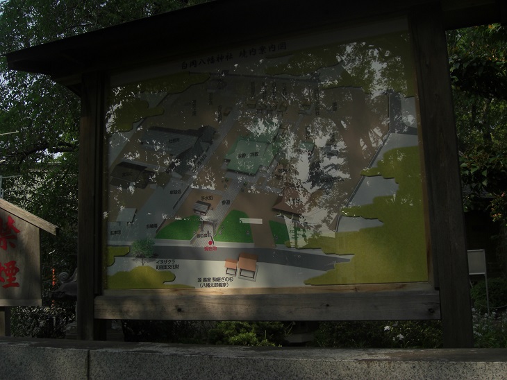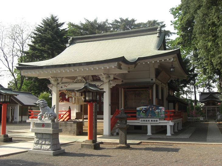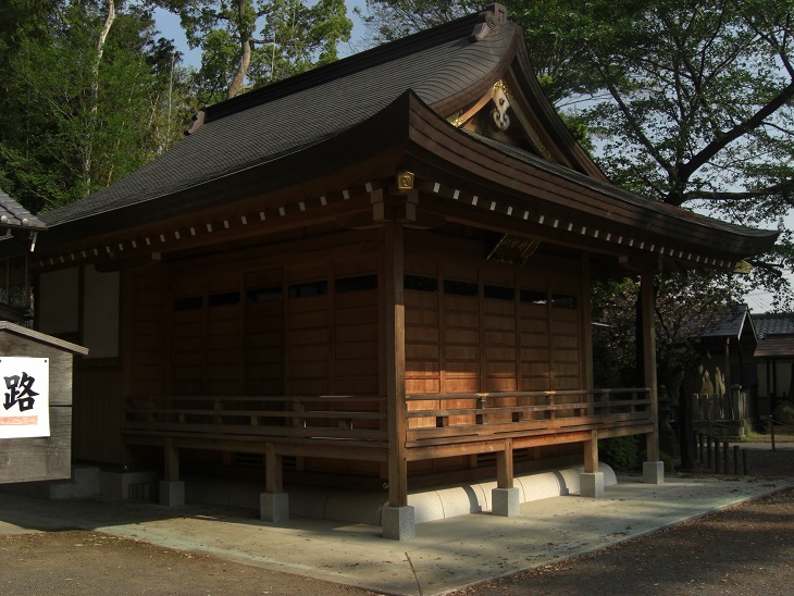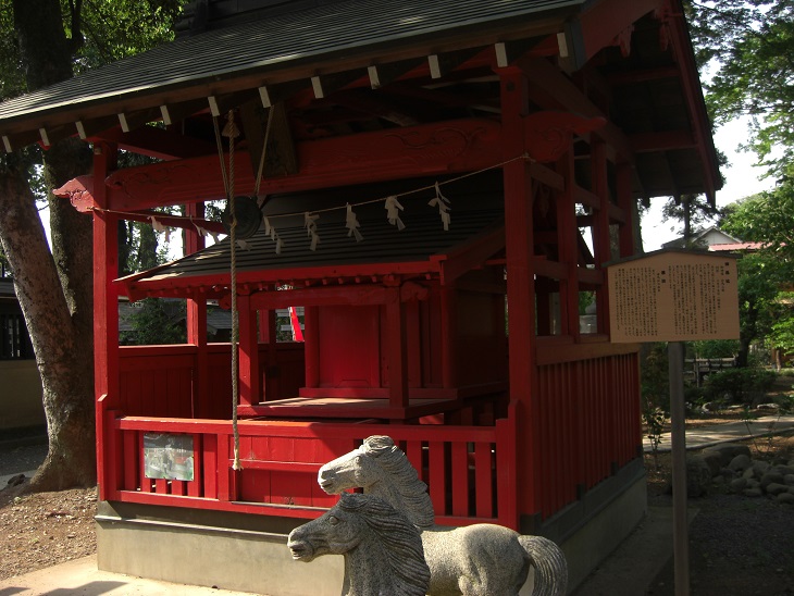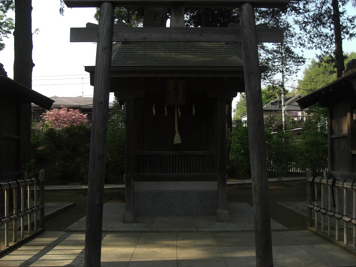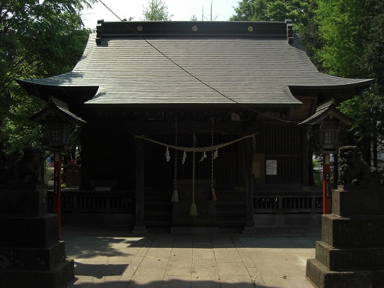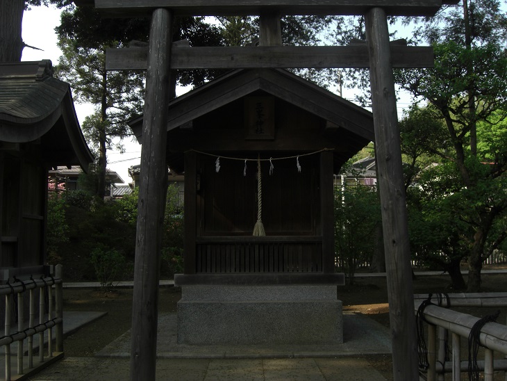 当社は日高団地に面した雑木林の中にあり、本殿は一間社流造り見世棚(みせだな)で、内陣には白幣を祀り、祭神は誉田別命である。