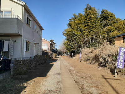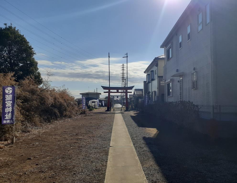 社の北側一帯には「宮山団地」が都市計画的に整然と立ち並んでいる。写真でも、参道の右側は、昔からの竹林が続いているが、左側は一戸建て住宅が建っている。