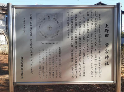 白岡市上野田地域は、市中東部に位置する。『風土記稿』において当初は上野田村と一村であり、野田村は江戸期の元禄~享保以前は埼玉郡百間領に属していたが、享保(1716~36)の初め頃に分村したという。昔から下野田地域との境界が入り乱れているために、例えば、下野田の鎮守社である鷲宮神社は上野田の地域内になってしまっている。