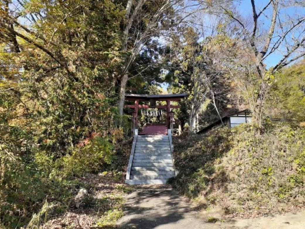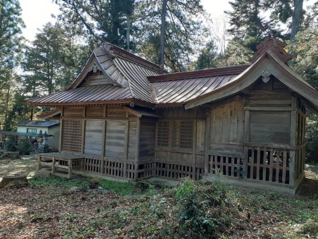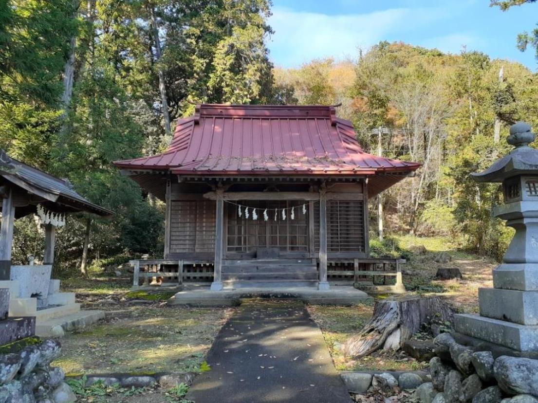 本来ならば、上記の丁字路を直進し、県道を200m程先まで進んだそのすぐ右手の道幅の細い路地を直進すれば社の正面に達するのだが、周辺には適当な駐車スペースが見当たらなかった為、社の後ろ側に達するルート説明をした次第である。