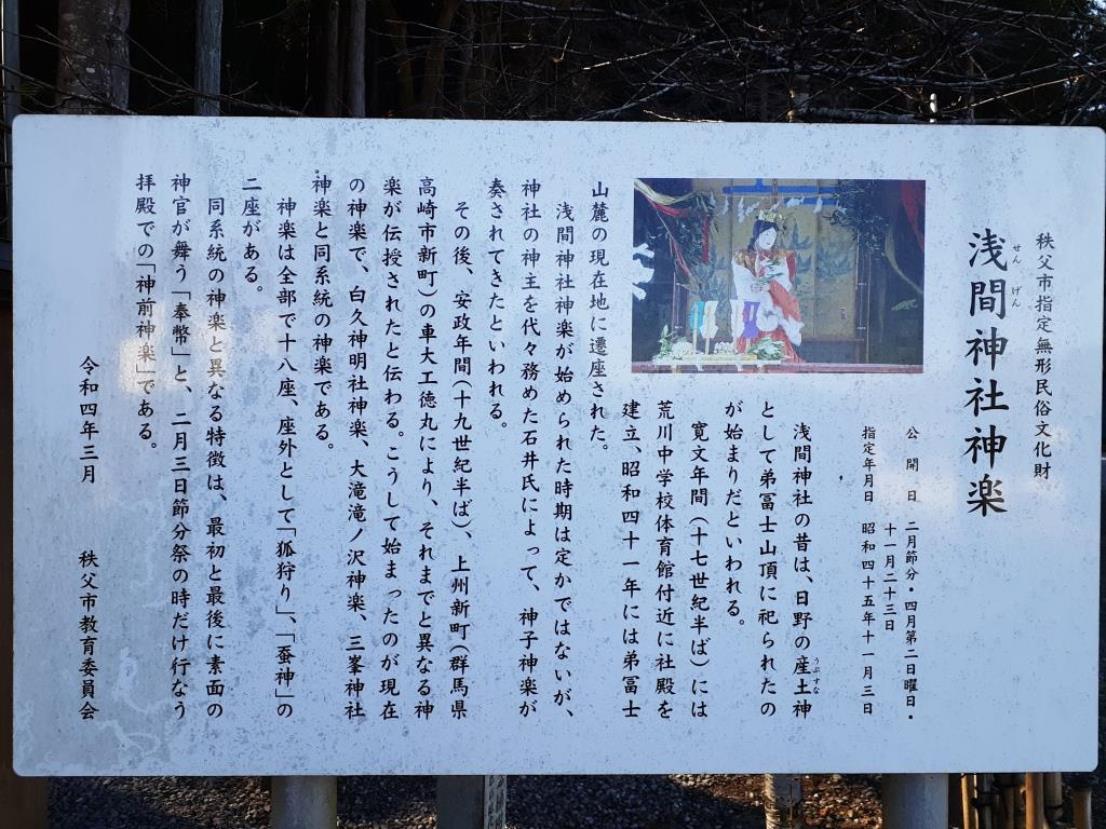 神楽殿脇に設置されている神楽の案内板 一の鳥居近くにも神楽の標柱あり