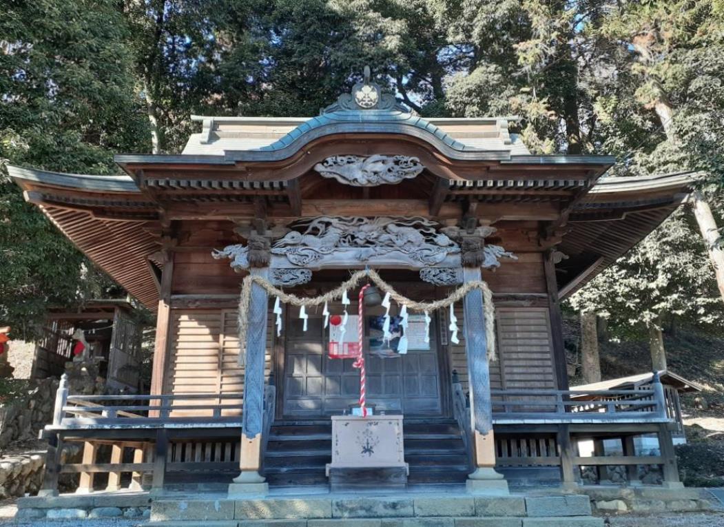 太田熊野神社を南下し、一旦埼玉県道43号皆野荒川線に合流後、西方向に600m程進むと、県道沿いで進行方向右手に鎮座している。東側に隣接しているホームセンターの駐車場をお借りしてから参拝を行う。