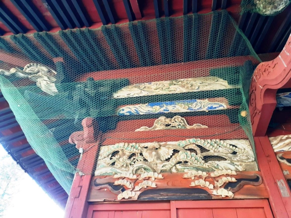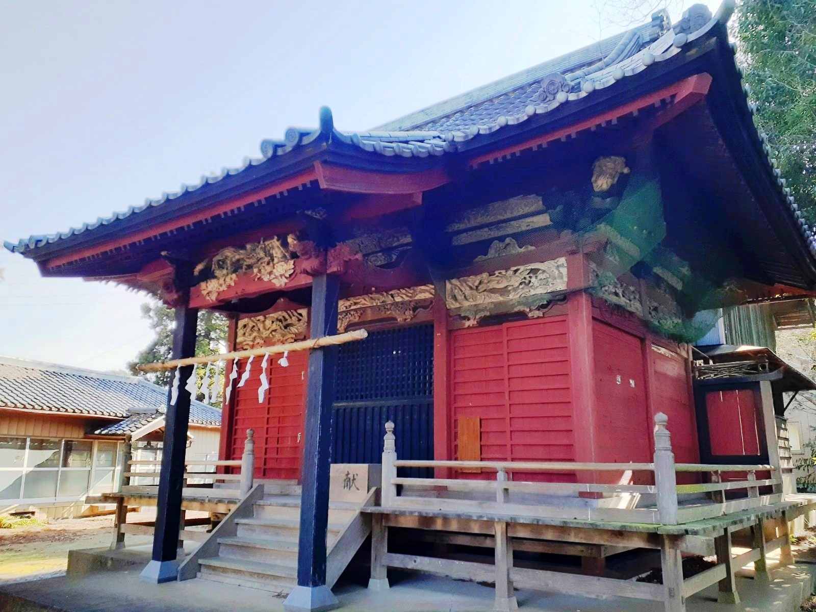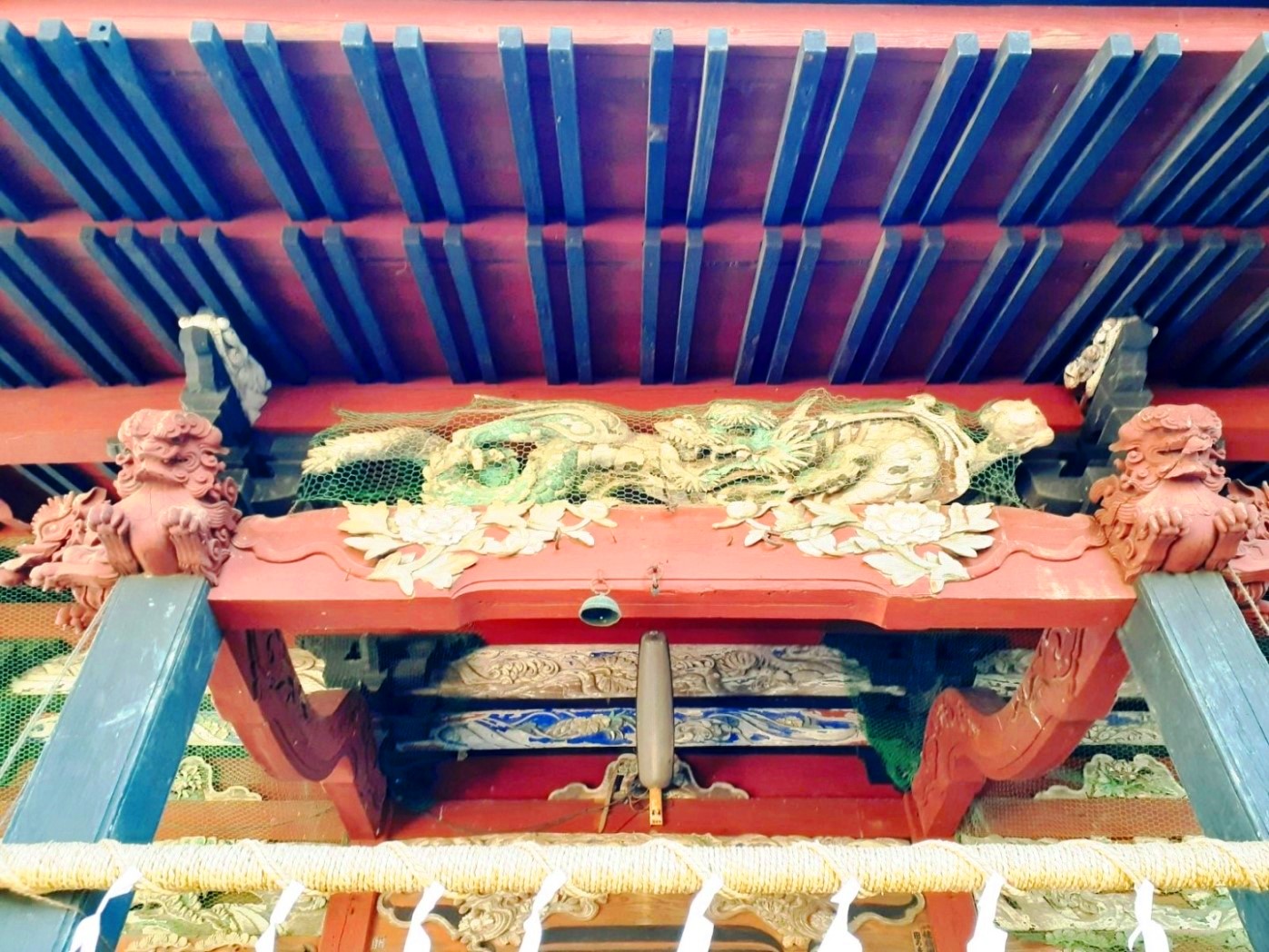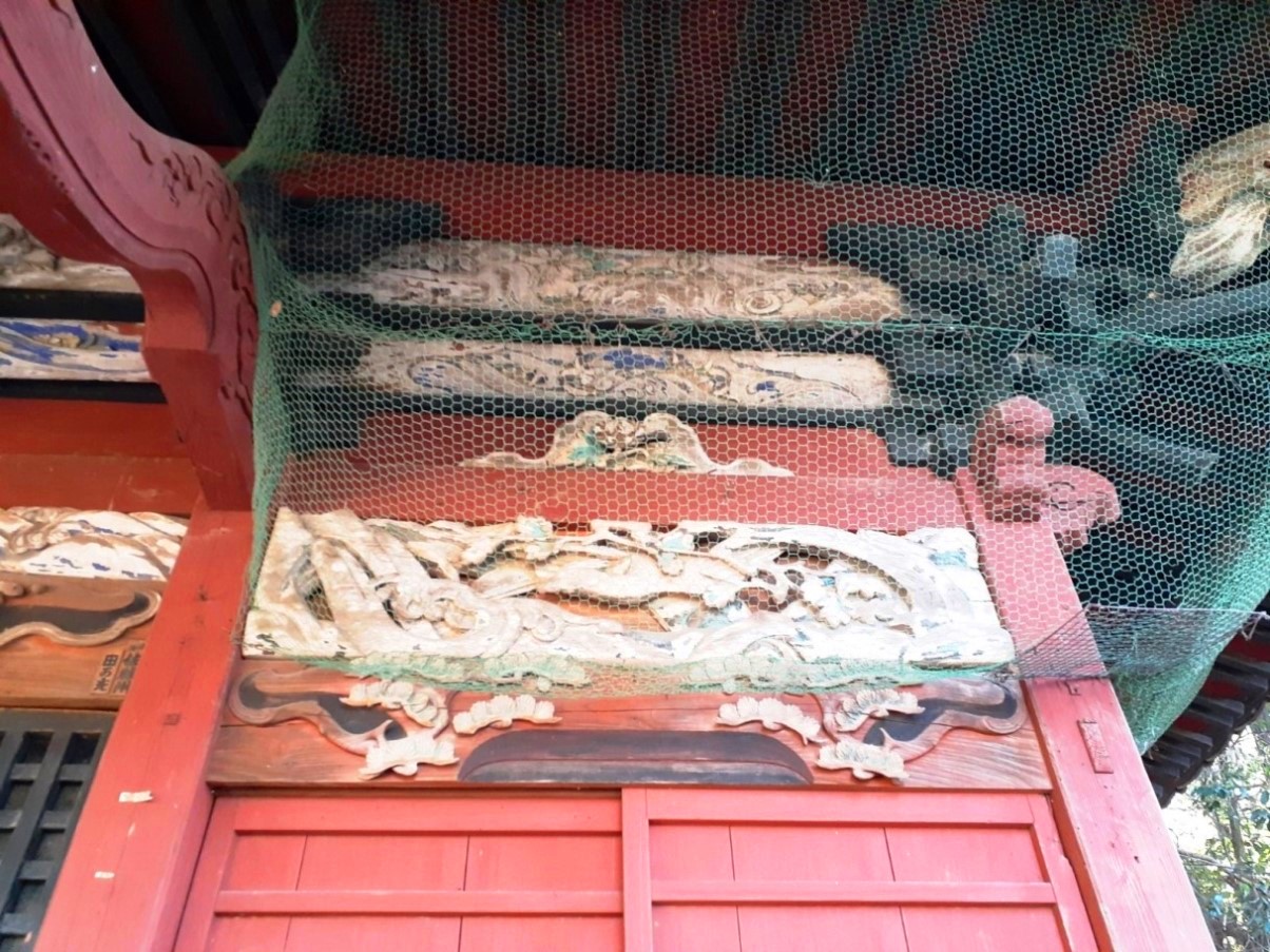 拝殿上部に飾られた彩色豊かで煌びやかな彫刻が目を引く(写真左・右)。