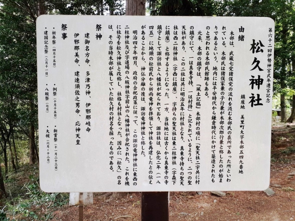 木部松久神社は、埼玉県道31号本庄寄居線を本庄市方面に北上する。「甘粕」交差点を直進すると「美里町 踏切手前左折 遺跡の森総合公園」の看板の先のT字路を左折、道なりに700m程進むと真東寺や木部松久神社の社叢が見える。木部松久神社に隣接する真東寺の駐車スペースを利用して、そこに車を停めて参拝を行った。