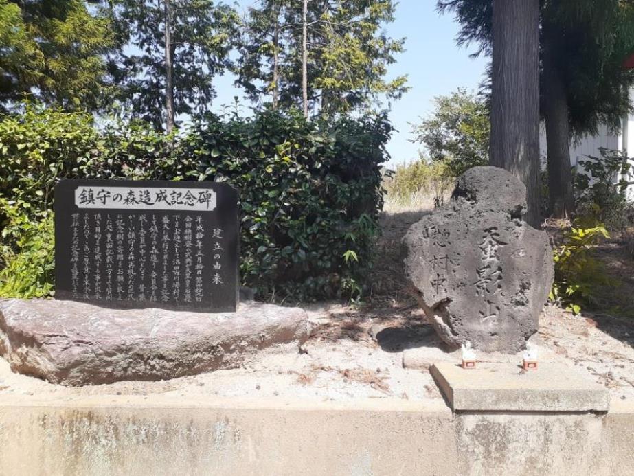 「鎮守の森達成記念碑」と蚕影山の石碑