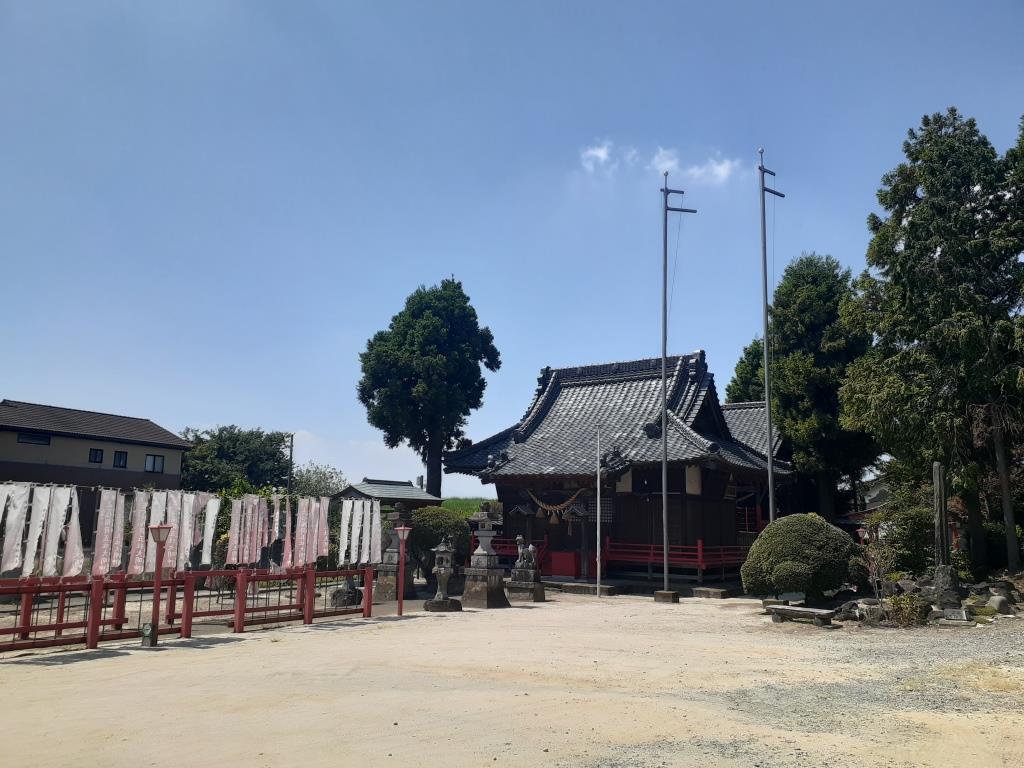 要約すると、八斗島町は利根川流域にある町で、元々は「稗島」という中洲であり、社は安土桃山時代の天正年間(1573~1592)の創立と伝わっている。当時、那波城主だった大江顕宗が奥州九戸戦争で討死し、その家臣である境野主水吉澄・五十嵐無兵衛知徳の両人が遺志を奉じて、当国利根川の中州の荒野を開拓、その五穀豊穣の守護神として奉斎されたのが当社の起源との事。御祭神は、倉稲魂命・大宮姫命・大田命・大己貴命・保食命の五柱。明治になり、村社に列し、明治43年(1909年)には神饌幣帛料供進社に指定されている。