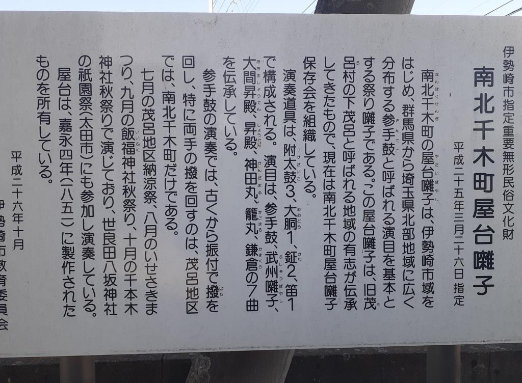 南北千木町の屋台囃子は、伊勢崎市域をはじめ、群馬県から埼玉県北部地域に広く分布する参手鼓(さんてこ)と呼ばれる演目を基本とする祭り囃子である。この屋台囃子は、旧茂呂村の下茂呂と呼ばれる地域の有志が伝承してきたもので、現在は南北千木町屋台囃子保存会を組織している。